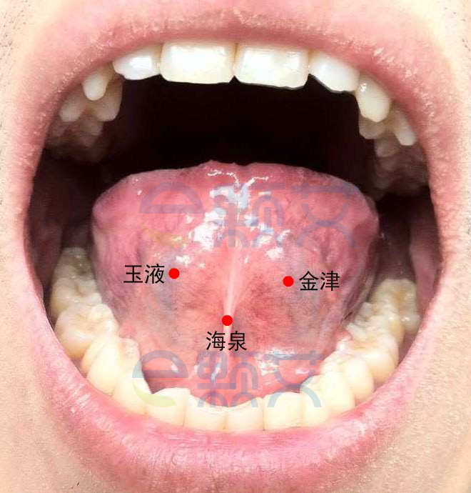 定位: 正坐张口,舌卷向后方。在口腔内,当舌下系带中点处。