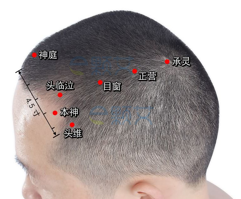 在头部,当前发际上0.5寸,神庭旁开3寸,神庭与头维连线的内2/3与外1/3交点处。