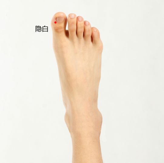 这个穴道在脚上大脚趾末节的内侧,距离脚趾甲的距离大约是0.1寸左右。隐白穴是脾的重要穴道之一,
