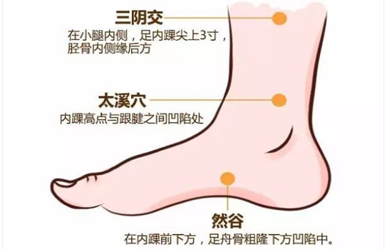 位置:它在足内侧,先找到足内踝尖,在其前下方可以摸到一块隆起的骨头,这个粗隆的下方就是然谷穴了。